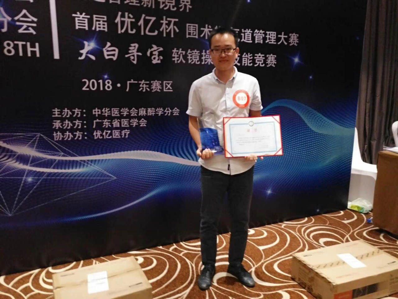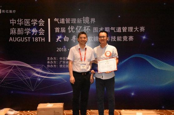 近日,在“第一届粤港澳大湾区麻醉医学学术会议暨第八届粤港澳台麻醉学学术会议及2018年广东省医学会麻醉学学术年会”上,我院麻醉科医生邹振飞力压群雄,荣获广东省首届“优亿气道软镜大赛”冠军,为医院及麻醉学科争得了荣誉