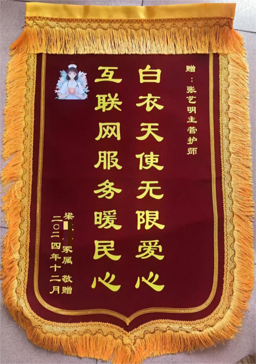这天,茂名市人民医院神经内科三区收到了一份特别的礼物——一面绣着“白衣天使无限爱心,互联网服务暖民心”的锦旗。这面锦旗由患者梁阿姨(化名)的家人通过邮寄方式赠送给该科主管护师张艺明,为的是表达对她在过去的几个月里不辞辛劳,亲自上门为患者提供悉心护理的衷心感谢。