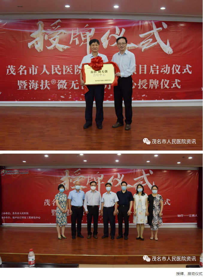 开幕式上,我院张锋华书记、唐志忠副院长,中山大学附属第一医院姚书忠教授,重庆医科大学的超声医学工程国家重点实验室张练教授,广东省人民医院叶海燕教授,广东医科大学附属医院张颖教授以及我院妇科主任潘敏教授共同为海扶刀®项目启动剪彩。张炼教授代表超声医疗国家工程研究中心为茂名市人民医院授牌。