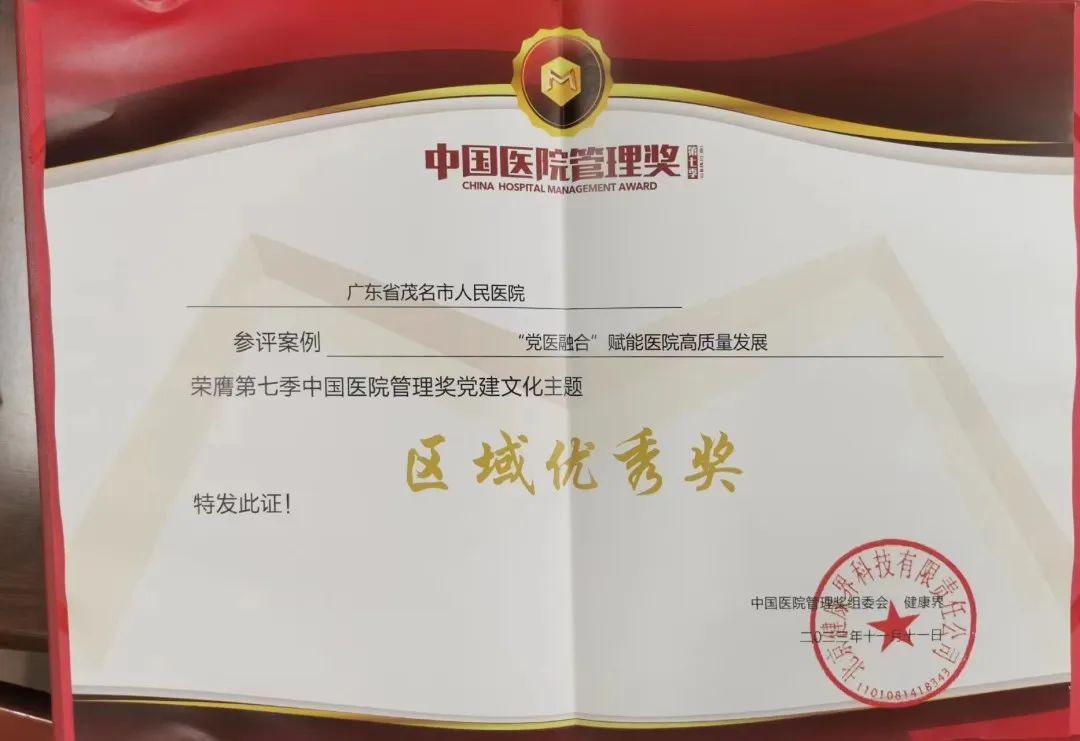 2023年11月11日,以"宽见与高驰"为主题、由健康界、中国研究型医院学会等机构联合主办“2023年中国医院管理年会”在海口会议中心隆重召开。茂名市人民医院荣膺第七季中国医院管理奖党建文化主题区域优秀奖。