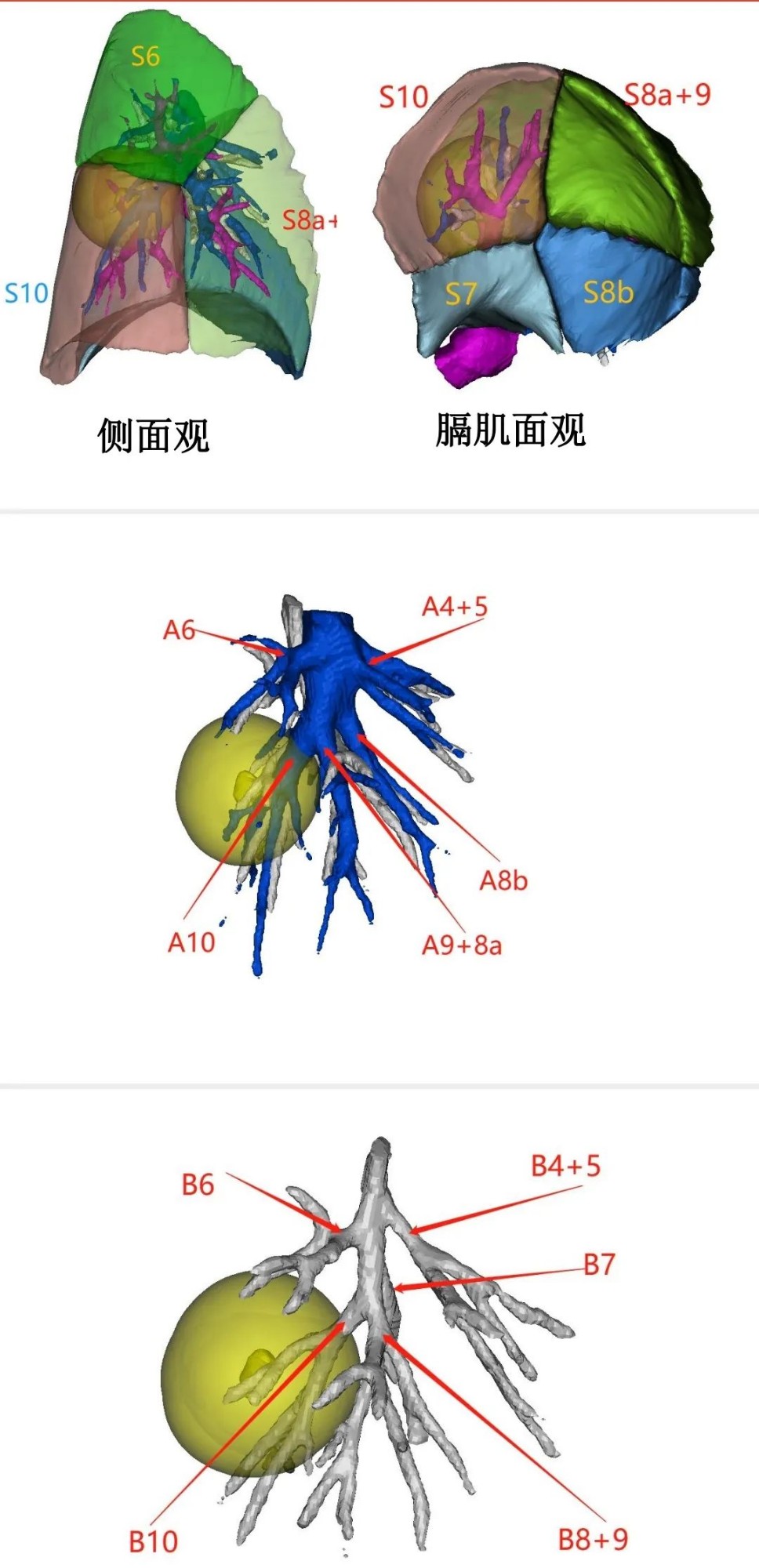“由于患者病灶较小、以磨玻璃成分为主,又位于右下肺后基底(S10)段中央,如果直接切除整个肺叶,那么会对患者肺功能损失较多。这种情况运用术前三维重建技术就非常有必要了。”茂名市人民医院胸外科科室负责人罗志强副主任介绍道,“三维重建技术是基于胸部增强CT的数据,借助特殊软件进行三维血管及支气管成像,能准确锁定病灶所在支配区域,精准地确定病灶的安全切缘范围,从而制定精准手术方案。而且结合术中荧光胸腔镜可实现肺段边界可视化,能实现更加安全、精细、准确的微创手术。”