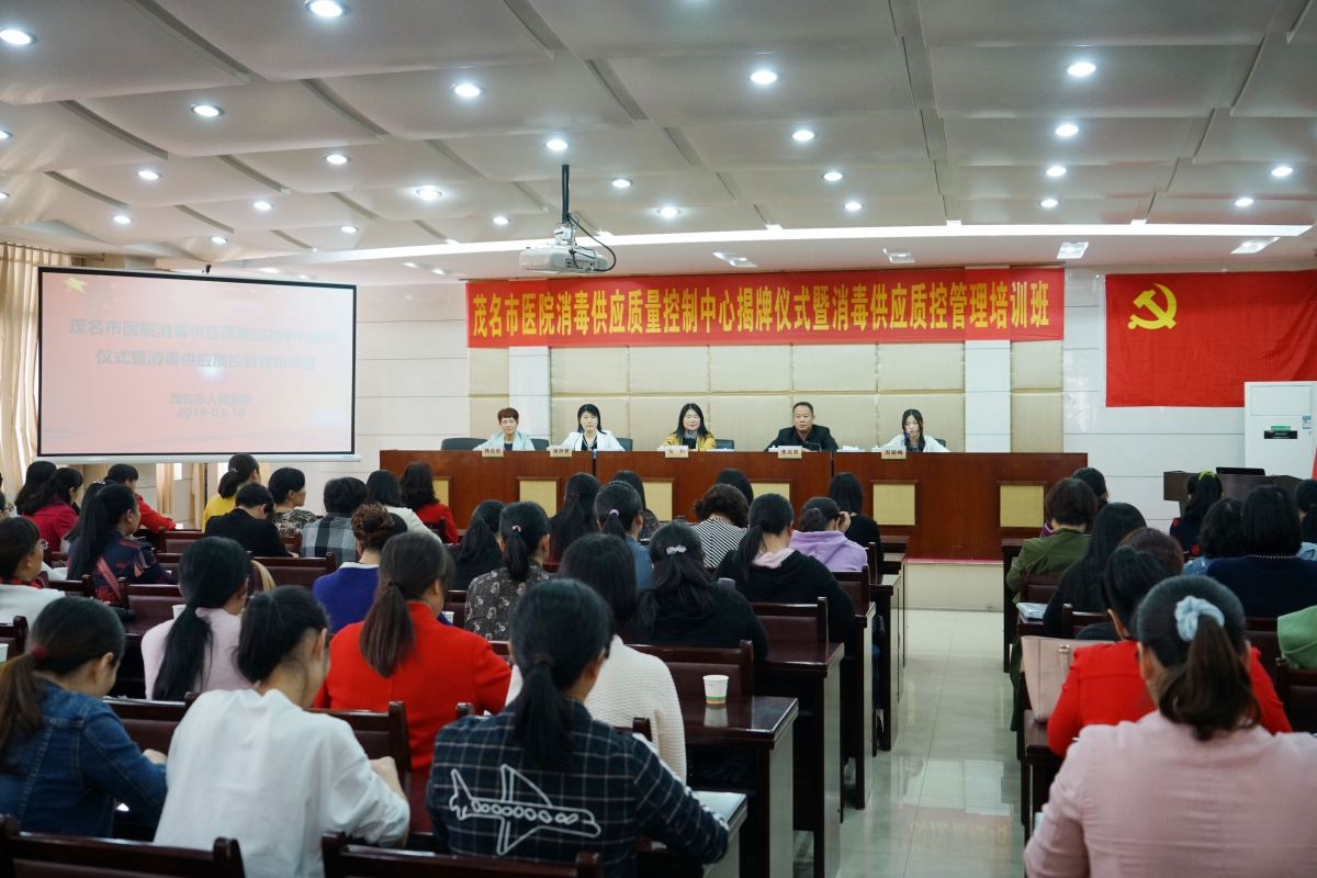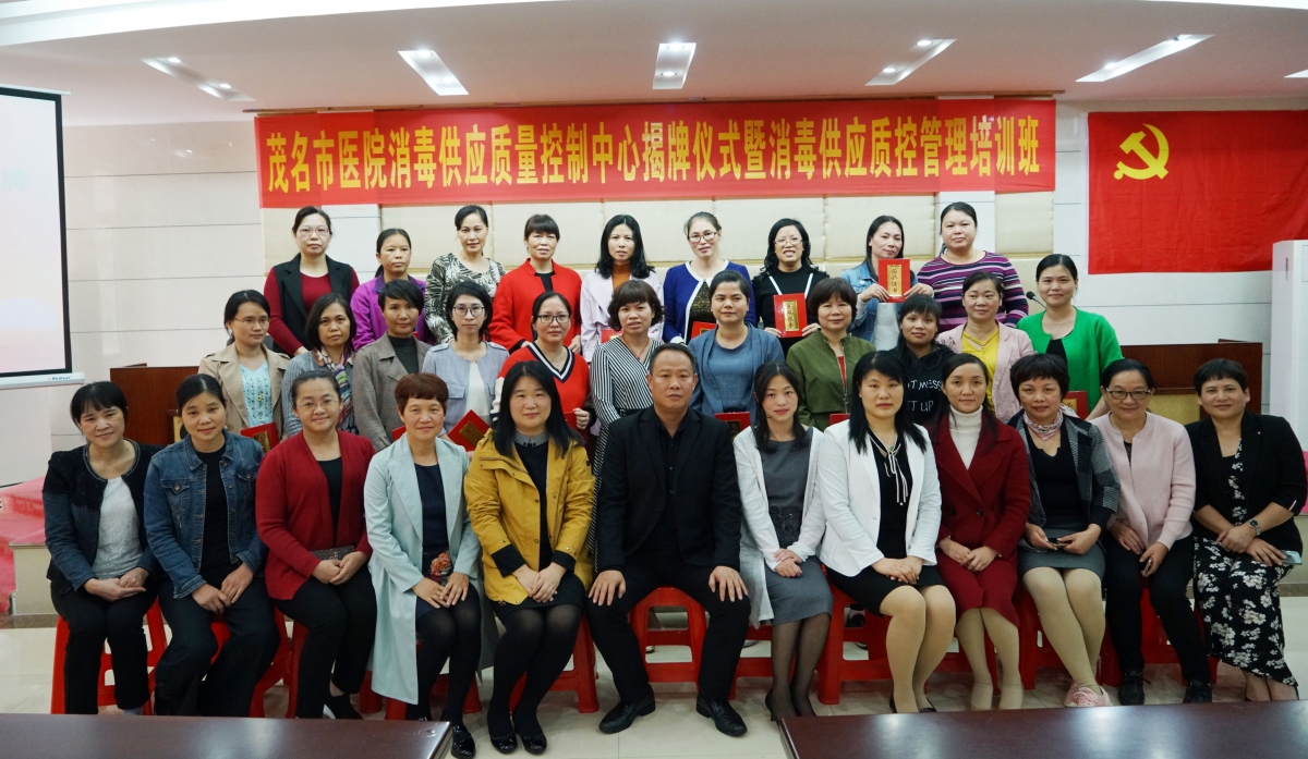为进一步加强全市医疗机构消毒供应中心的管理,提高全市医院消毒供应质量,规范各级各类医疗机构消毒供应服务,茂名市医院消毒供应质量控制中心揭牌仪式暨消毒供应质控管理培训班于3月16日在我院行政楼四楼举行。来自茂名市各医疗机构共180多名医护人员参加本次会议,我院副院长麦远其、护理部负责人谢静誉、茂名市卫生健康局医政科副科长周丽梅出席了揭牌仪式。