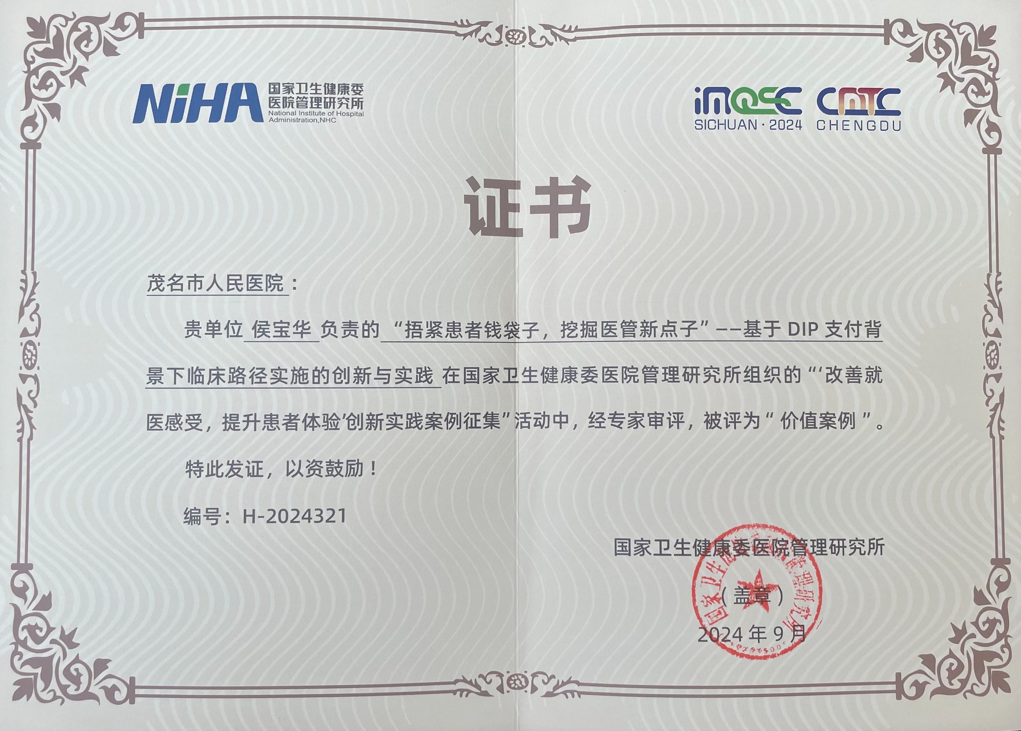 近日,国家卫生健康委医院管理研究所公布了“改善就医感受,提升患者体验”创新实践案例征集活动入围名单。由茂名市人民医院申报的《“捂紧患者钱袋子,挖掘医管新点子”——基于DIP支付背景下临床路径实施的创新与实践》入选“价值案例”。茂名市人民医院是茂名地区唯一获此殊荣的医疗机构。