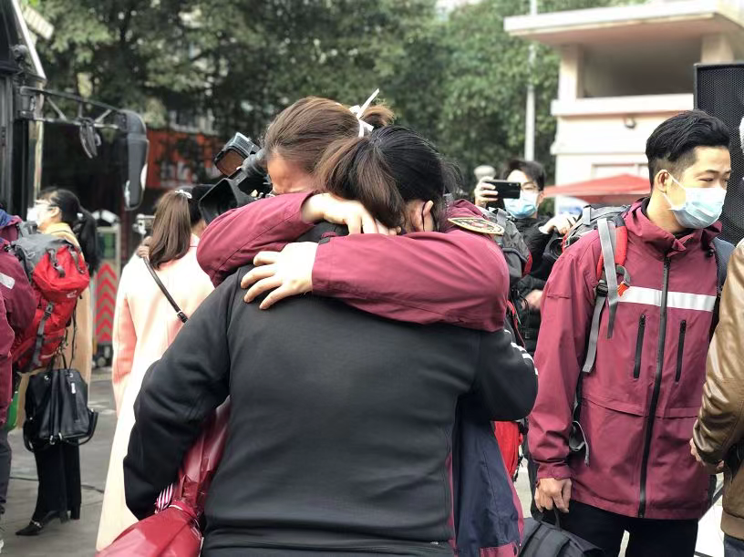 刚刚与即将出征的小女儿合影的周爸爸骄傲地说:“我让她一定要去,年轻就是要为国家贡献力量!”感染科的护士周仲梅与姐姐牵手站在一旁笑的眉眼弯弯的,当问到选择报名出征后有什么变化的时候,她指着出征前夜减掉的长发说:“头发剪短了,但是很开心可以去帮助更多有需要的人。”