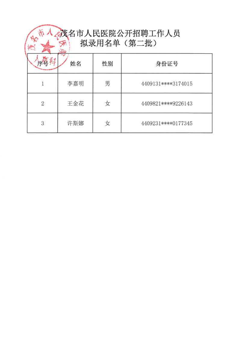 茂名市人民医院公开招聘工作人员拟录用名单公示