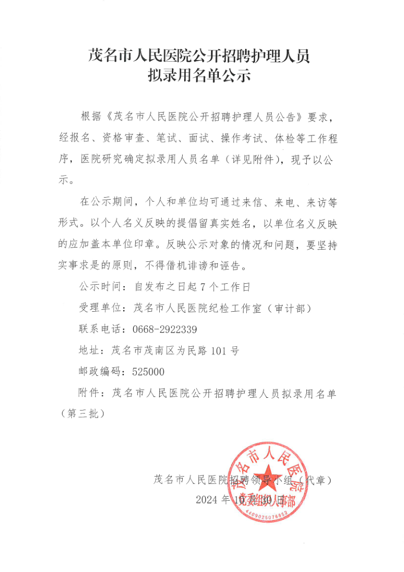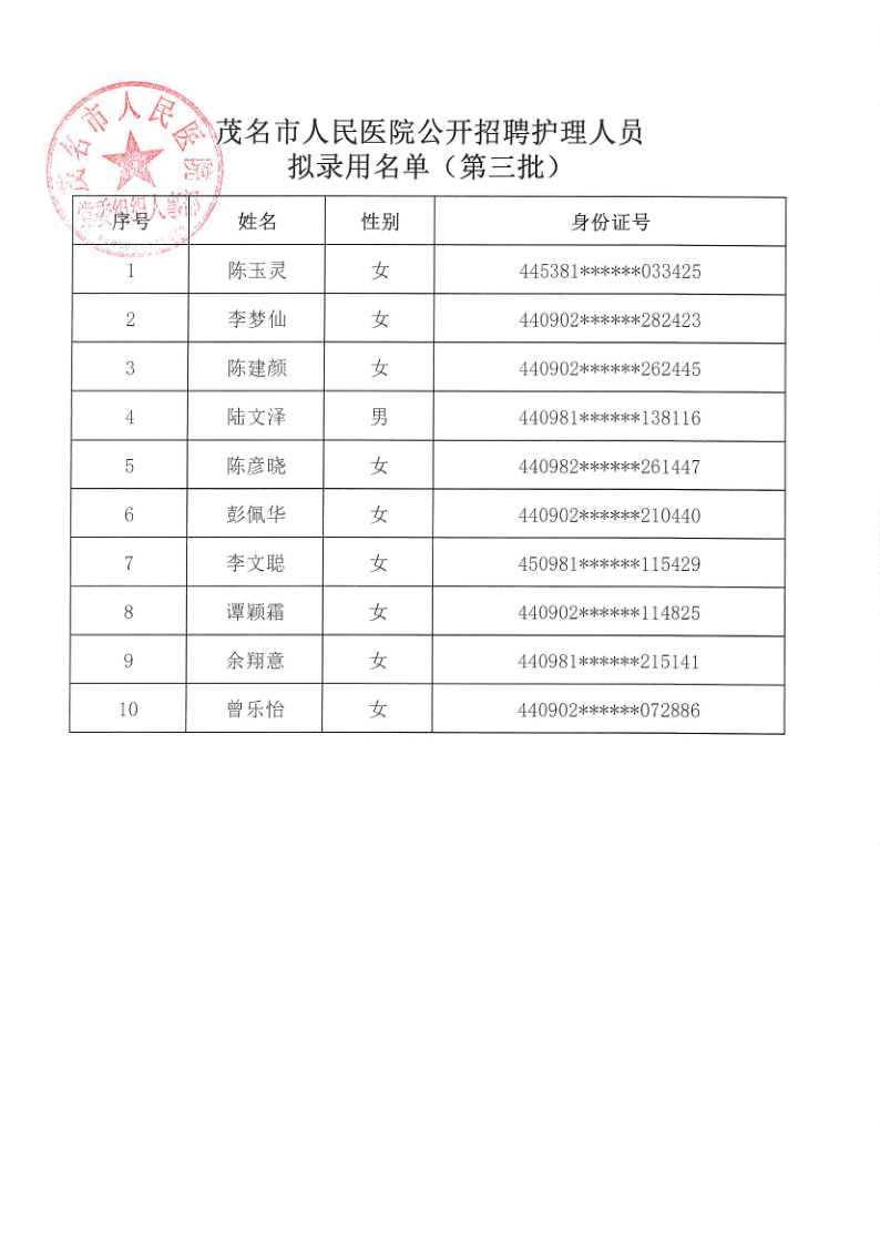 茂名市人民医院公开招聘护理人员拟录用名单公示(第三批)