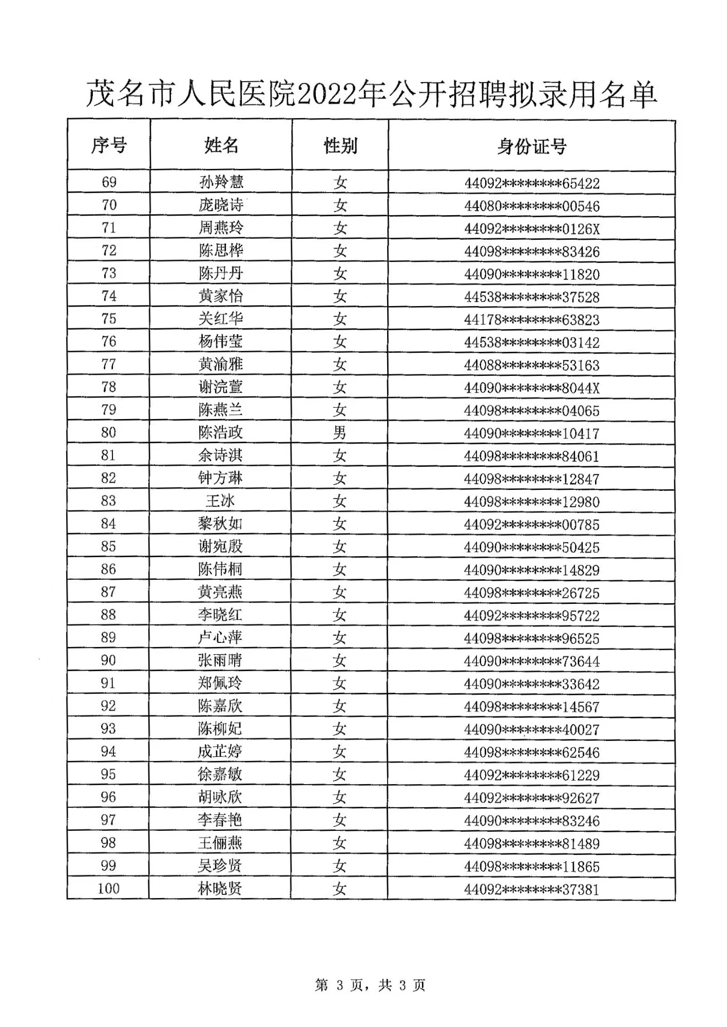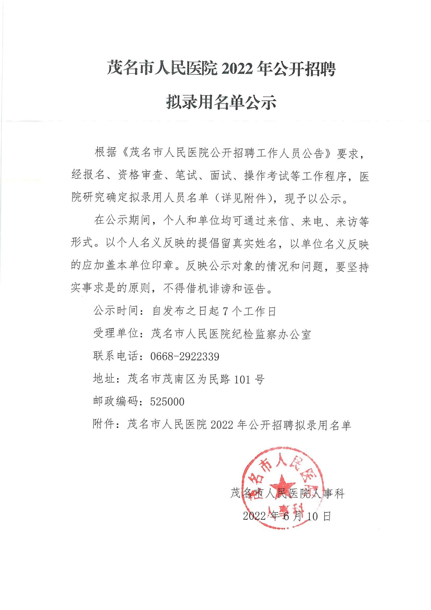 茂名市人民医院2022年公开招聘拟录用名单公示
