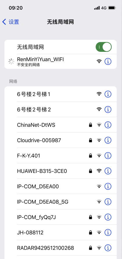 1.打开手机无线网络界面,搜索“RenMinYiYuan_WIFI”,点击连接。